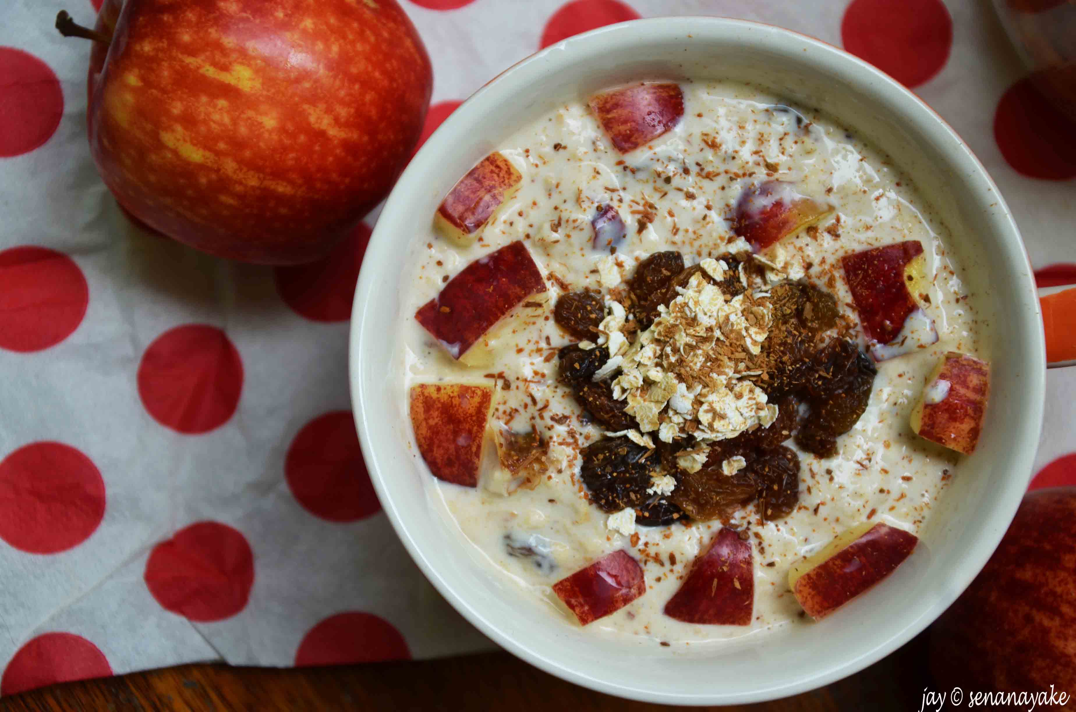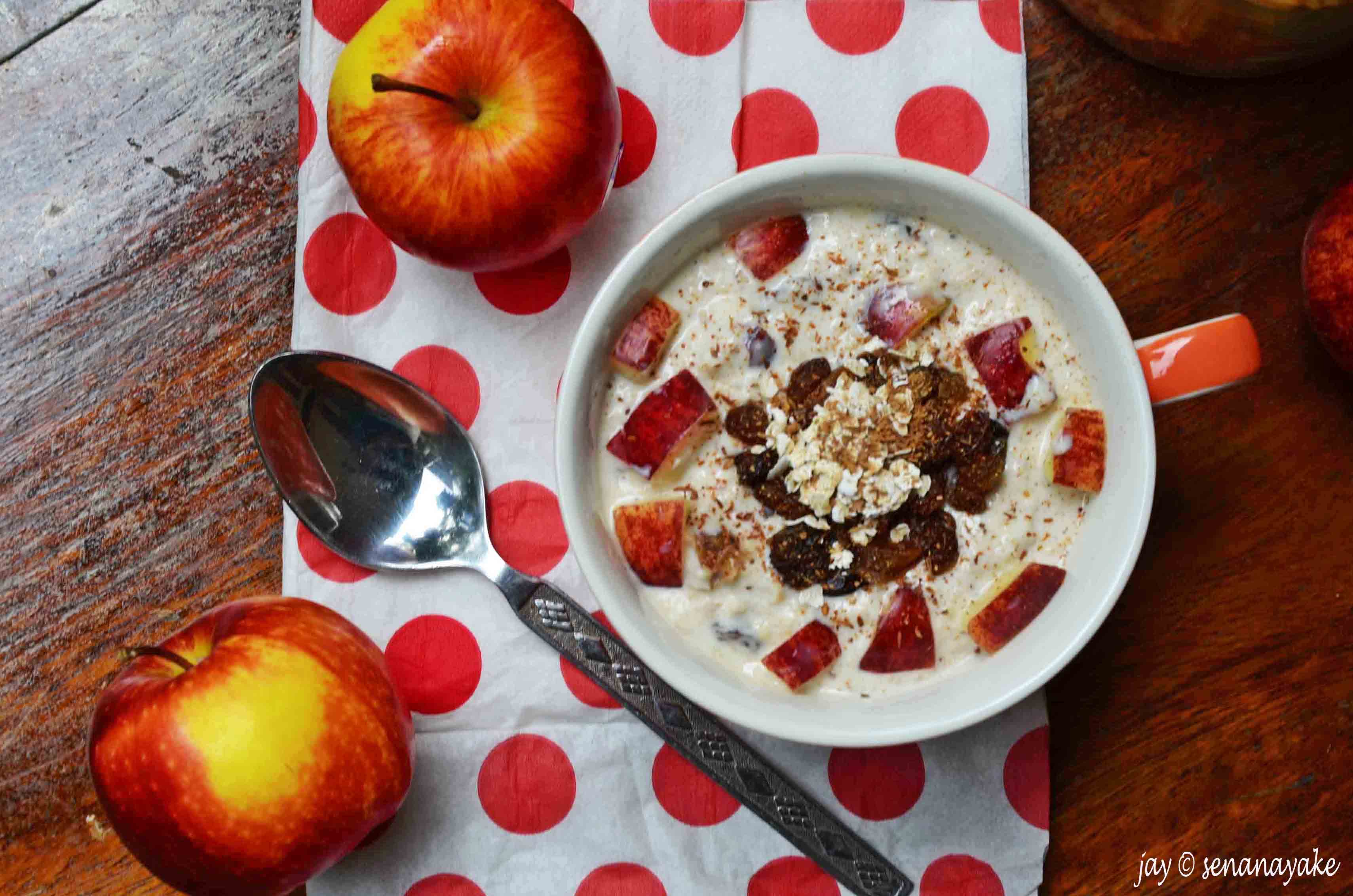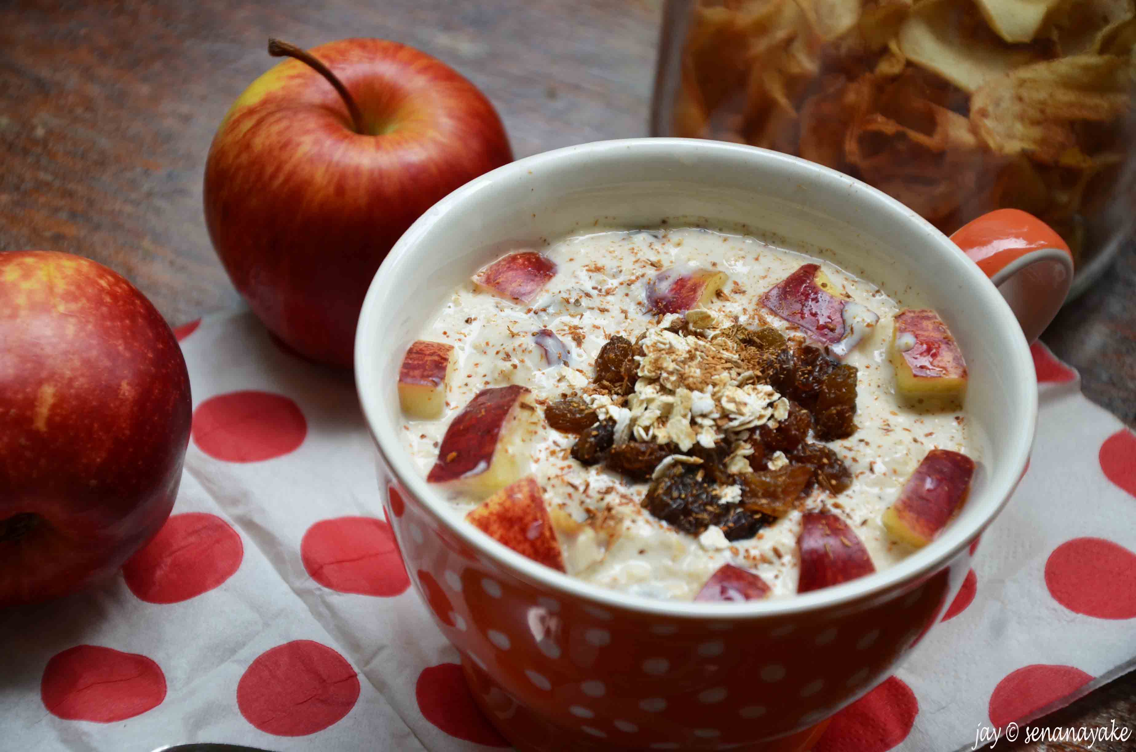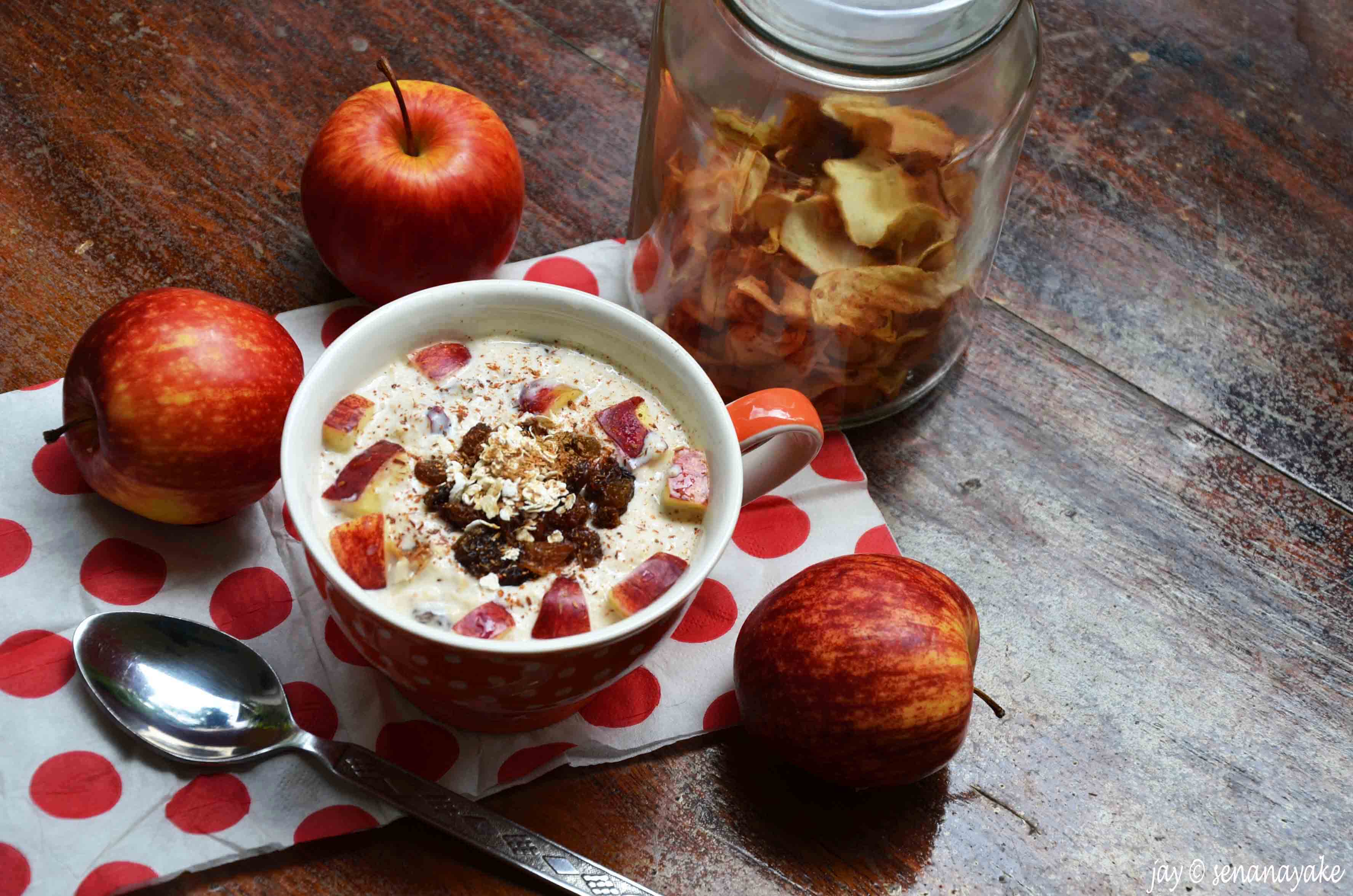 There you have it, apple pie for breakfast! The apples remain crunchy in the milky, cheesy mixture laced with the warmth of the spices while you bite into the nuts and raisins, each giving sweetness and lending flavour. Sprinkle some homemade apple chips on top and you got yourself a breakfast fit for a really hungry king. Although a cold dish, it warms you up from the inside and brings out that glow. It’s a happy dish. It makes me happy every single time :)