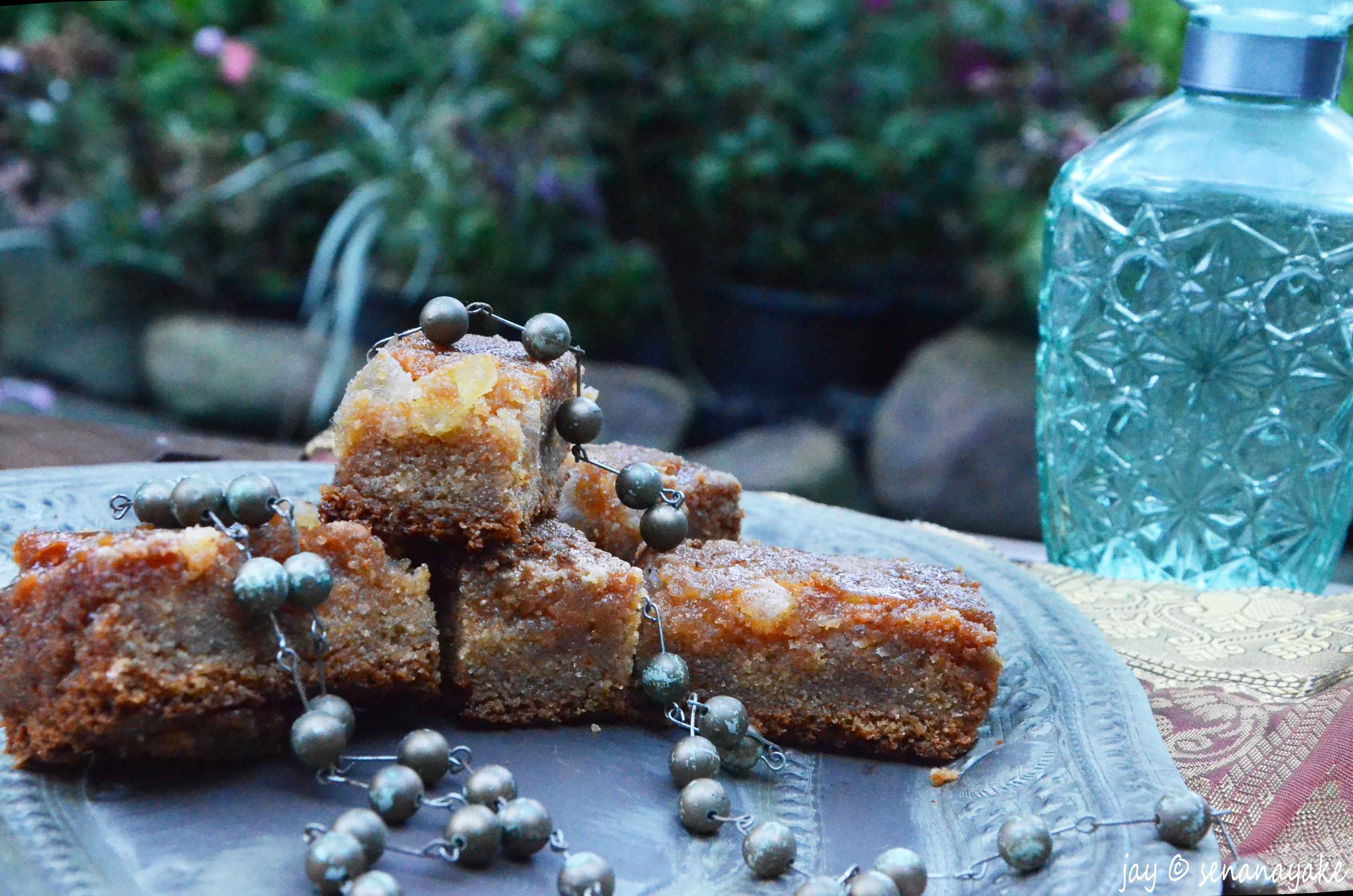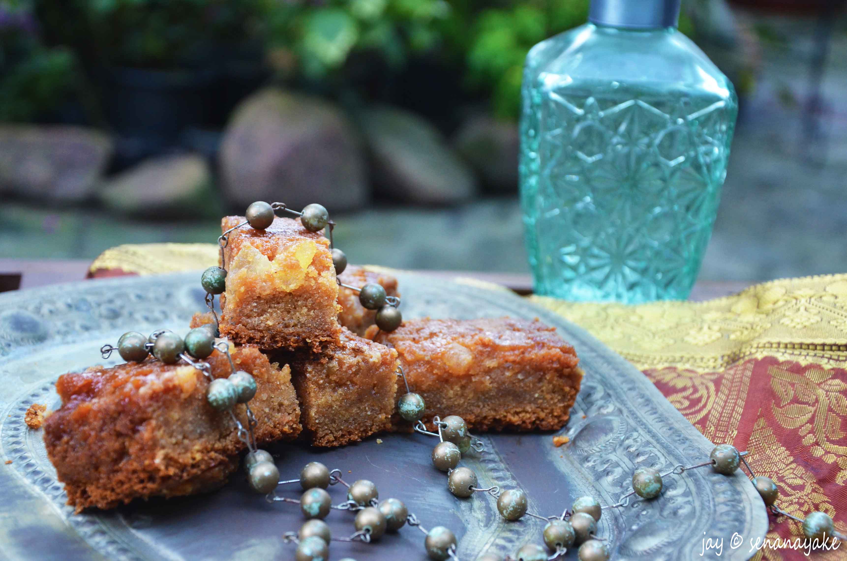 Beware of its humble appearance, the Sri Lankan Love cake is a very ordinary looking cake sans frills of fancies. Brown and uninteresting at the first glance, there is nothing exciting about its look. But then you take a bite and……. It’s love at first bite! Literally. Fragrant, spicy, floral, nutty, fruity – it’s everything wonderful and more. With a heady mix of scents – rose, cinnamon, almond, cardamom, clove and nutmeg, it woos the nose at first, while the teeth sink into a texture that is at first slightly crunchy but sinfully moist and rich in the centre. The tongue meets the nubby texture of the toasted semolina while the teeth occasionally meets the juicy pieces of pumpkin preserve and the cashew nuts, where the creamy taste of cashews encounters and compliments the sweetness of the preserve. The spices pierce through the richness of it all, harmonizing with the rich floral note of the rose where the sensual and the nutty dominate. Occasionally you encounter the zestiness of the lime rind and when you do, it’s a wonderful surprise. The tangy, the sweet, the floral, the spicy – everything merges in a beautifully seductive dance in this sensual experience summarized into a very unassuming looking cake. It’s like the world’s most exotic brownie – gooey, chewy and very much comforting. And uniquely, Sri Lankan. It is the taste of home.